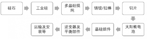 光伏行业产业链如下所示,要经历多个过程,硅石才能变成我们看到的能发电的组件。