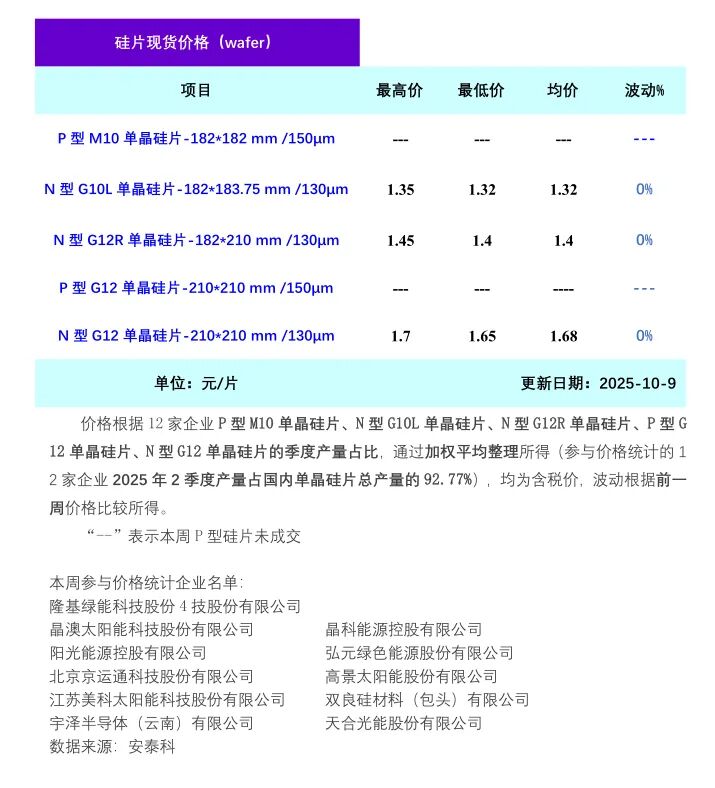 根据安泰科价格统计,硅片价格较节前暂无明显变化。其中,N型G10L单晶硅片(182*183.75mm/130μm)成交均价为1.32元/片;N型G12R单晶硅片(182*210mm/130μm)成交均价为1.40元/片;N型G12单晶硅片(210*210 mm/130μm)成交均价为1.68元/片,各型号硅片价格与节前持平。