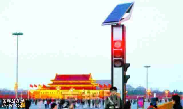 天安门广场新增两对太阳能红绿灯,红绿灯全部由太阳能主板供电。自此,广场三个人行横道红绿灯全部实现太阳能化。